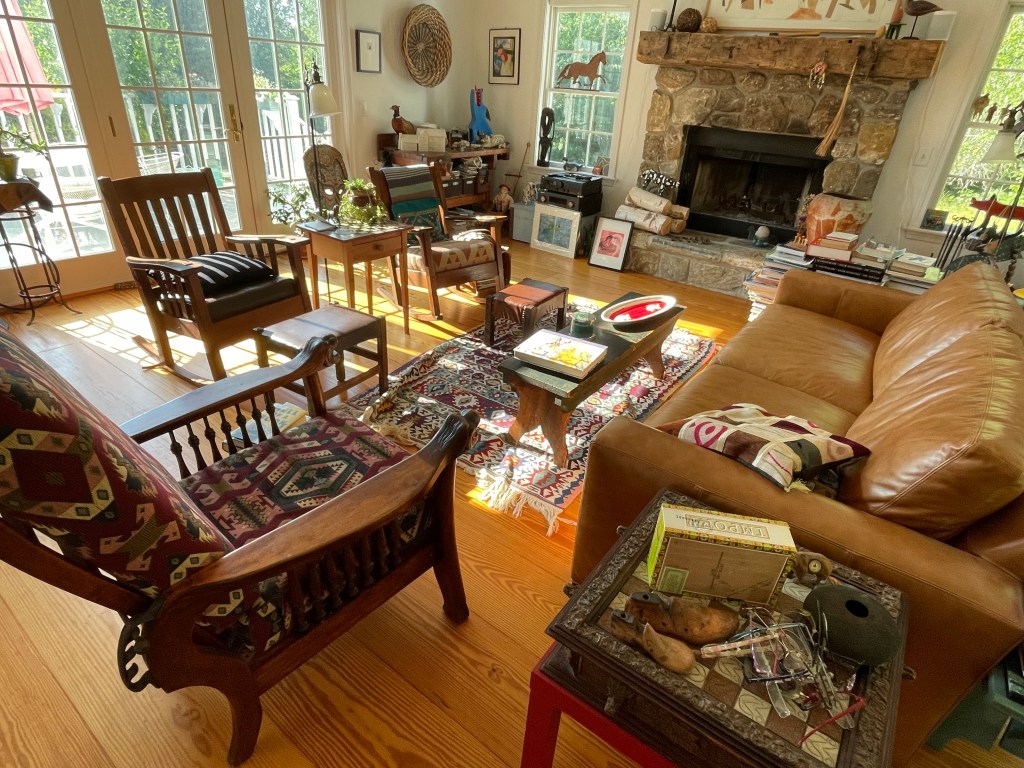 With the insurance money in hand, Frank, who had no experience building anything more elaborate than the frames for Abby’s paintings, set about creating the plans for their new home, this time on the top of the hill. Once the house was built, the two of them scoured the area for gently used furnishings. And there you have it. Their new home is again filled with many more books than my spouse would allow me to keep, enough art to fill a mid-sized museum, and a garden that justifies their collective hard work.