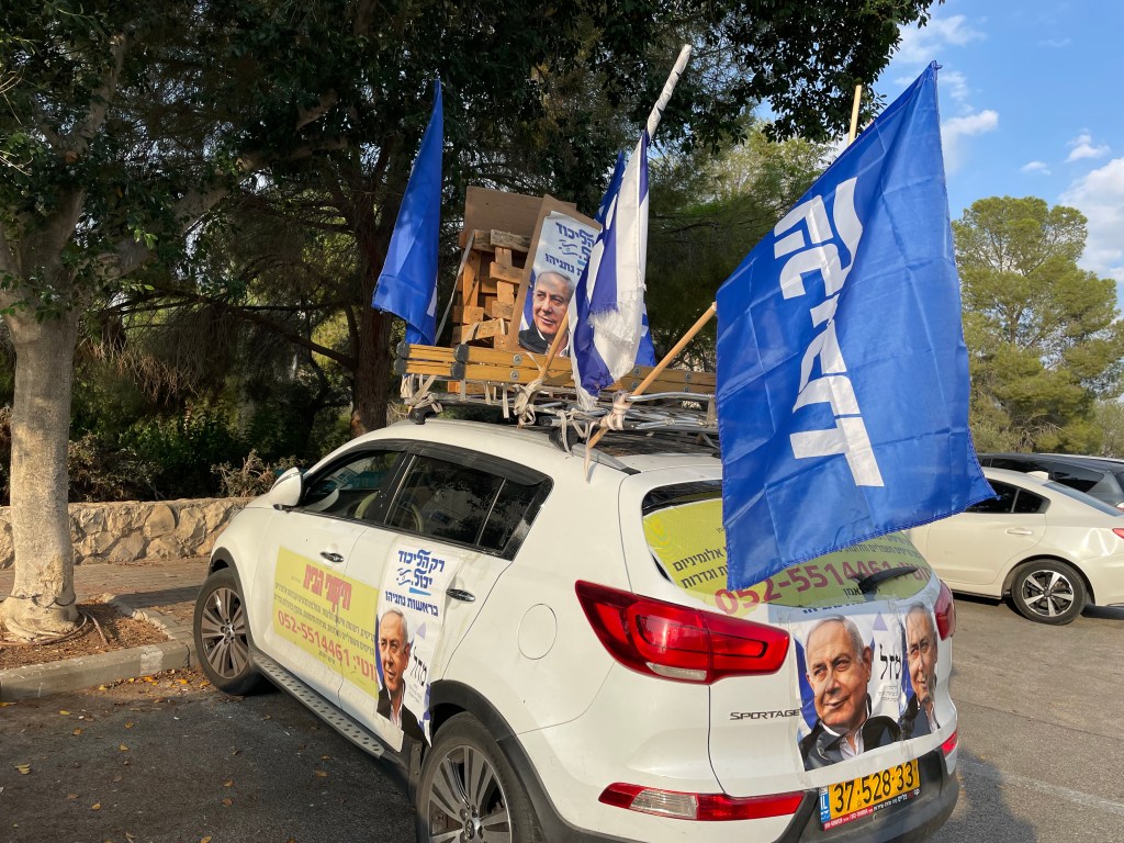 I’ve always wondered about this strange dude, and what he’s trying to accomplish by covering every inch of his vehicle with Likud banners, posters, and bumper stickers. Does he think I’ll be impressed, that he’s giving me reasons to vote for his candidate? Maybe he’s demonstrating to one and all that he is a Big Shot, that he’s angling for the 65th slot on the party list for the next election? As long as he doesn’t bother me, I won’t bother him. He is entitled to his views on the body politic, just as I am. But now they’re coming at me, dozens of them yelling ‘Rak (only) Bibi.’