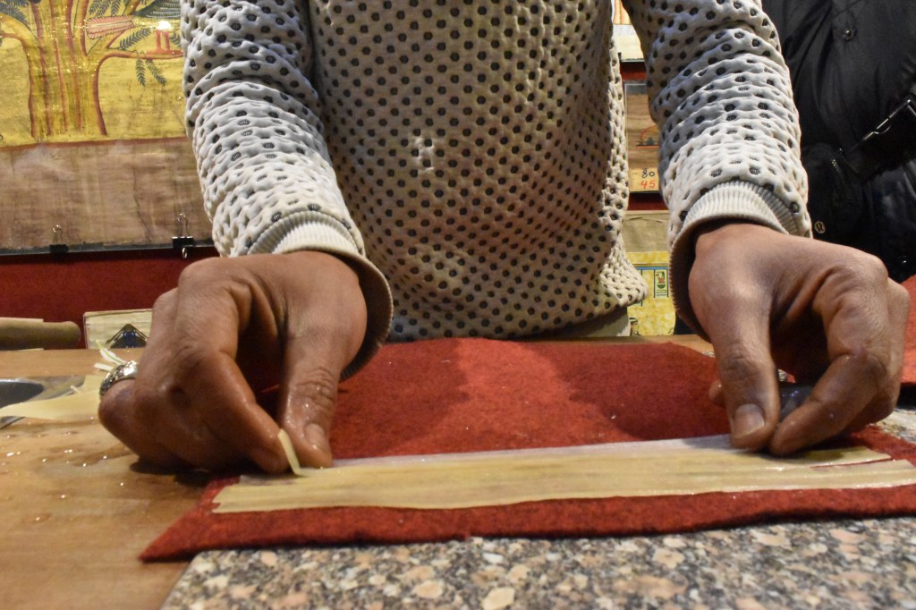 We got back on the bus, and I assumed we were heading back to the hotel. Wrong. We were off to a papyrus factory. At various places on our tour, we were shown papyrus plants growing in the swampy places where they hang out. If someone had asked me what part of the plant is used to make paper, I would have guessed the leaves. But that would have been one of those rare moments (extremely rare!) when I would (gasp!) have been wrong. The first thing they did at the factory, after giving us a warm welcome, was take us downstairs to a demonstration of how to turn thin, triangular shaped stems into something you can write on. First you slice them.