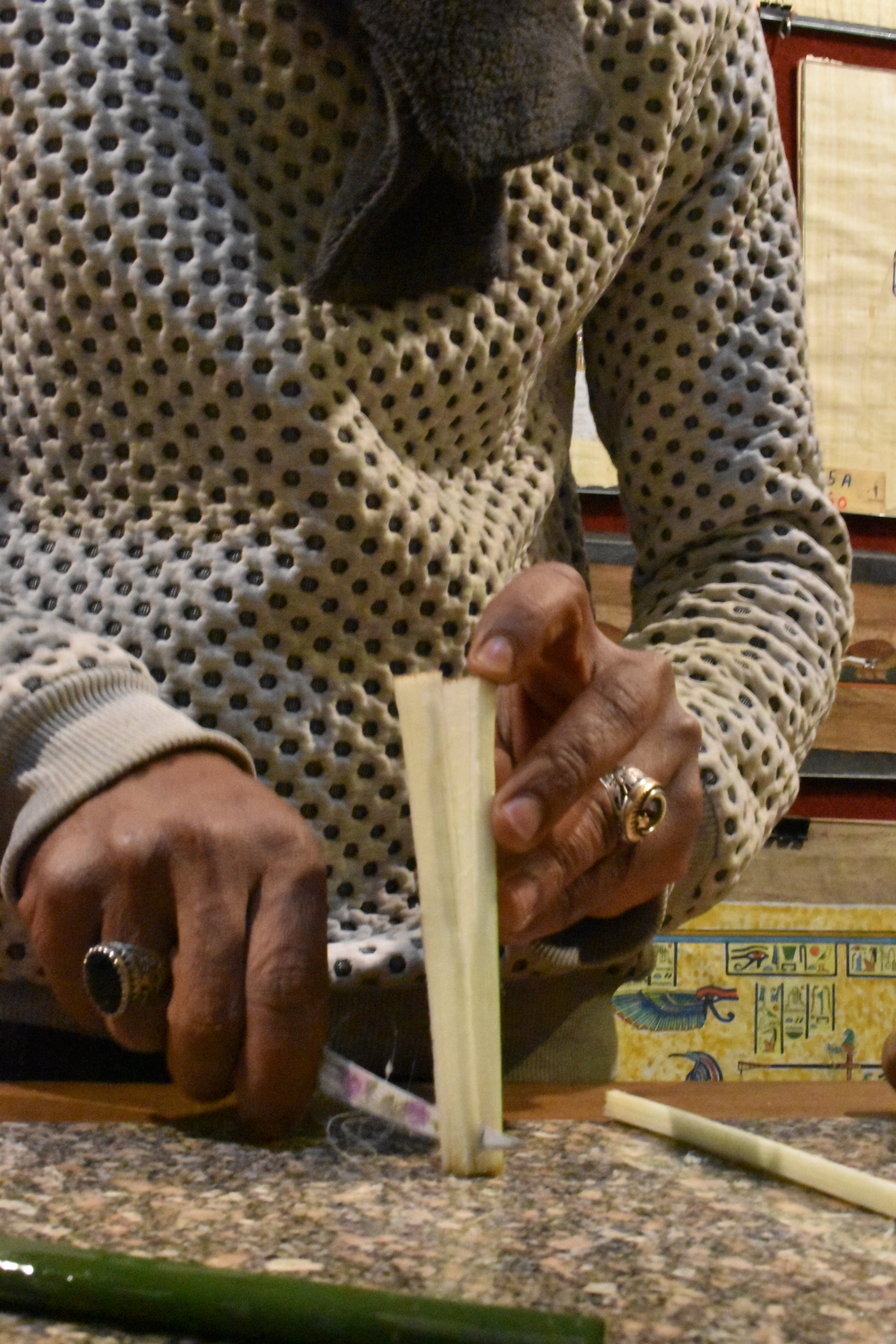 We got back on the bus, and I assumed we were heading back to the hotel. Wrong. We were off to a papyrus factory. At various places on our tour, we were shown papyrus plants growing in the swampy places where they hang out. If someone had asked me what part of the plant is used to make paper, I would have guessed the leaves. But that would have been one of those rare moments (extremely rare!) when I would (gasp!) have been wrong. The first thing they did at the factory, after giving us a warm welcome, was take us downstairs to a demonstration of how to turn thin, triangular shaped stems into something you can write on. First you slice them.